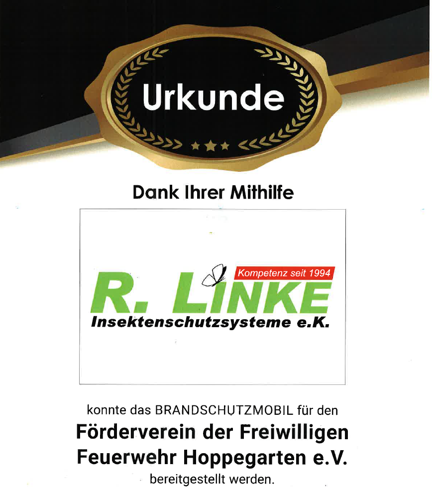 Durch eine großzügige Spende an den Förderverein der Freiwilligen Feuerwehr Hoppegarten e.V. konnte ein Brandschutzmobil bereitsgestellt werden. Wir, die Firma R. Linke Insektenschutzsysteme e.K., engagiert sich seit Jahren gerne für die Freiwillige Feuerwehr und unterstützt so die wichtige und lebensrettende Arbeit.
